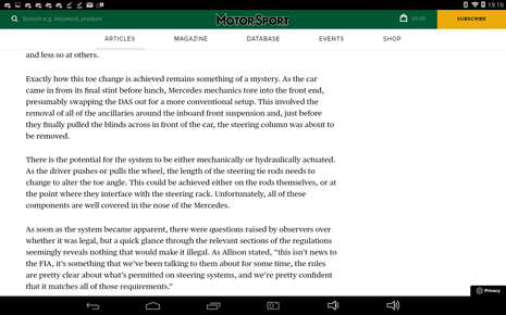 Το DAS,dual axis steering,εχει να κανει με το alignment οχι την αναρτηση.Το τιμονι ειναι κινητο μερος,επιτρεπεται γιατι εχει να κανει με το steering. Βεβαια αν το ψαξουν λιγο ισως βρουν και και κατι στην αναρτηση και το καταργησουν,μεχρι ωρας βγαζουν λαδι την Merc. 10.4.1 ...more than two... -