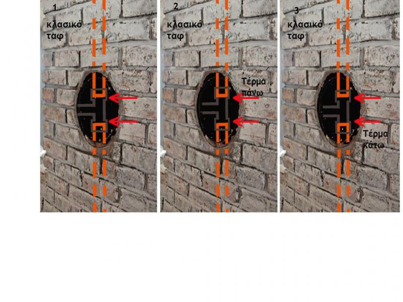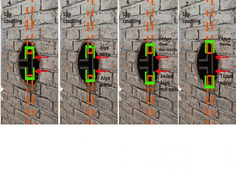 Αν ήταν έτσι δεν θα έφτιαχνα θέμα για να ρωτήσω. Προφανώς δεν ρώτησα σωστά οπότε λογικό να μην καταλάβατε σχωρέστε με. Οπότε ζωγράφισα ? αυτό που ήθελα να πω... Βλέπετε τον τοίχο, την (μαύρη) τρύπα και το ταφ... Φαίνεται κι ένα μικρό μέρος των σωλήνων (οι διακεκομμένες γραμμές είναι τα τμήματα των σωλήνων που είναι μέσα στον τοίχο). Λοιπόν: Τα κλασικά ταφ πάνε λίγο πάνω, λίγο κάτω, όπως φαίνεται από τα σχέδια 1, 2 και 3. Τα slip couplings (ας τα πούμε 'σπαστά ταφ' γιατί είναι σαν ταφ αποτελούμενα από 3 κομμάτια, το γκρι και τα δυο πράσινα) δίνουν πολύ μεγαλύτερη ευελιξία, όπως βλέπετε στα σχέδια 4, 5, 6 και 7. π.χ. για να το τοποθετήσεις τα βάζεις όπως στο σχέδιο 7, κατεβάζεις στη θέση που θες το πάνω πράσινο, ανεβάζεις στη θέση που θες το κάτω πράσινο και καθάρισες... Οπότε, ΑΝ χρειαστεί, αφαιρώ το ταφ κόβοντάς το με ένα ντρέμελ π.χ. (υπενθυμίζω ότι οι σωλήνες είναι μέσα στον τοίχο (διακεκομμένες πορτοκαλί γραμμές) και ΔΕΝ κουνιούνται, οπότε για να αφαιρέσω το ταφ πρέπει να το καταστρέψω. Και θέλω να αποφύγω παραπάνω σκάψιμο, γι αυτό και όλη αυτή η φασαρία) Οπότε η ερώτηση είναι: υπάρχουν 'σπαστά ταφ' στην αγορά; Δεν έχω δει πουθενά. (αν δεν υπάρχουν θα πρέπει να φτιάξω αυτοσχέδια) -