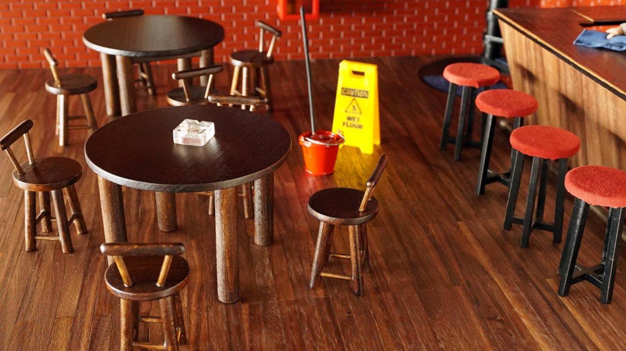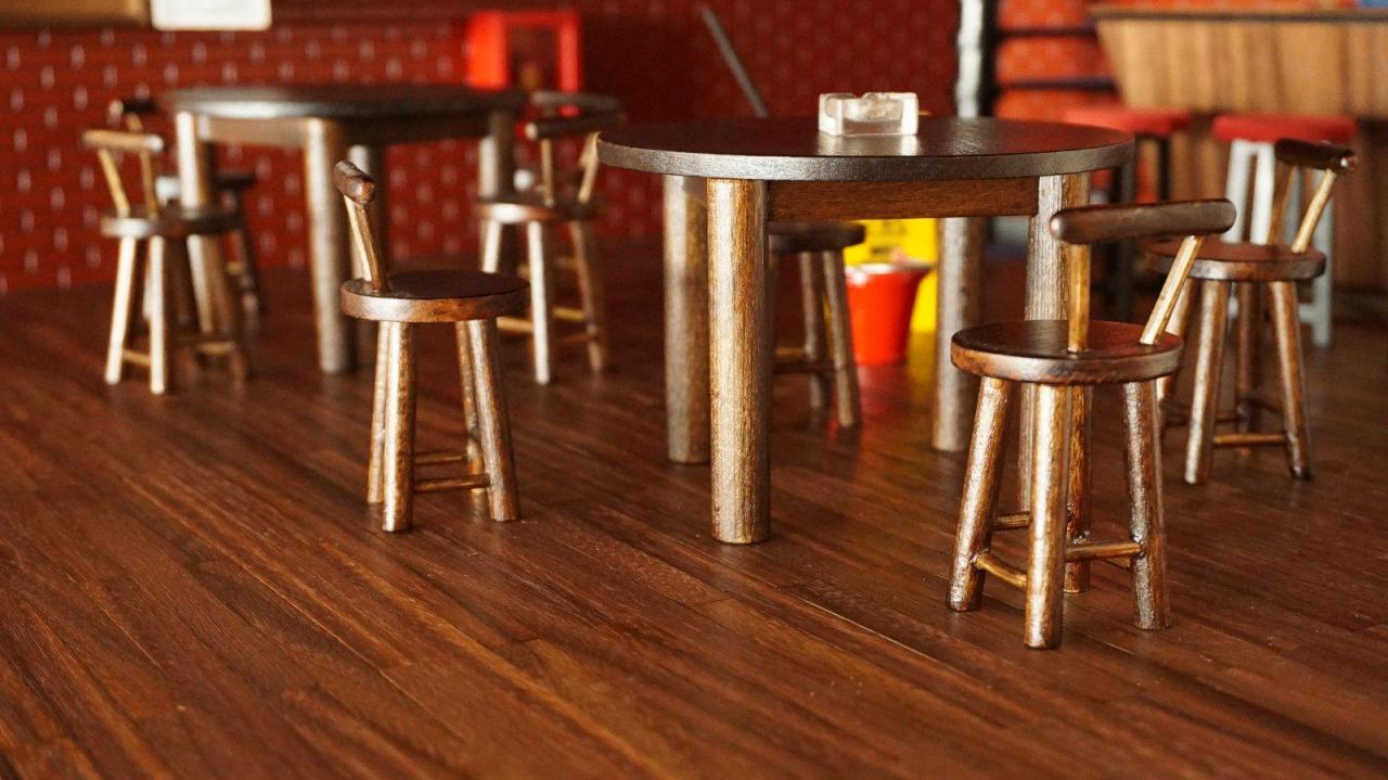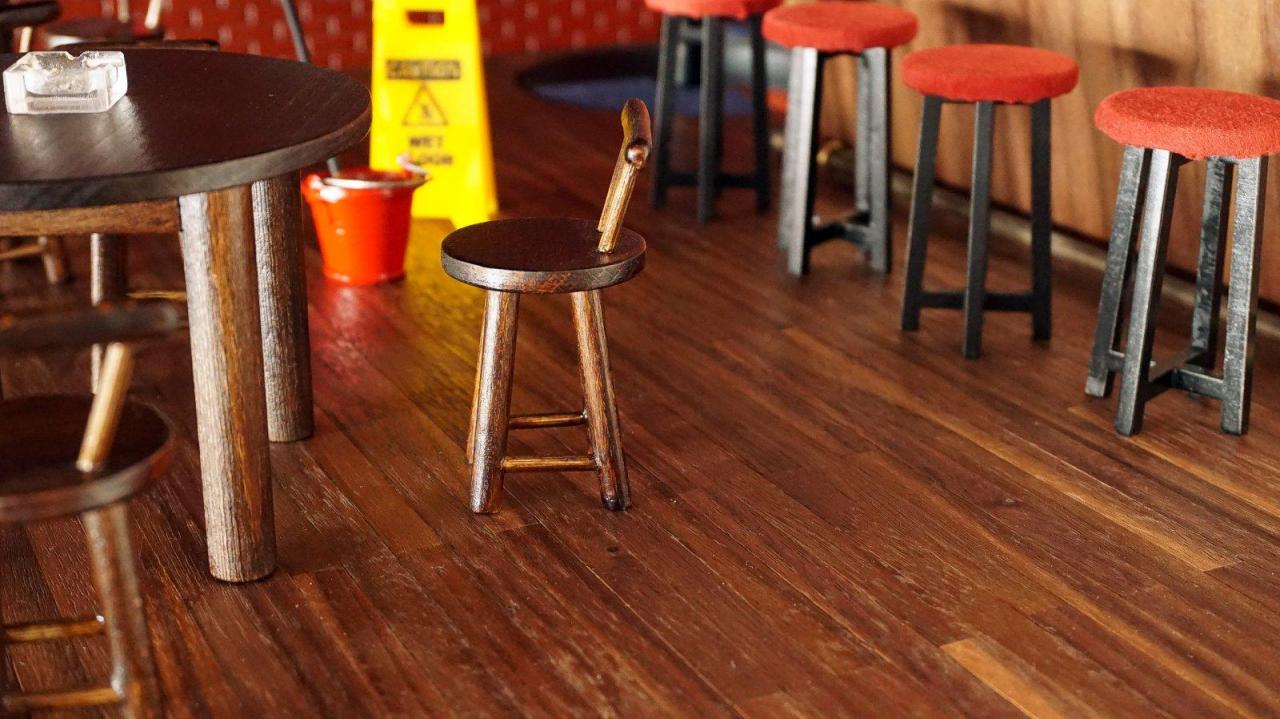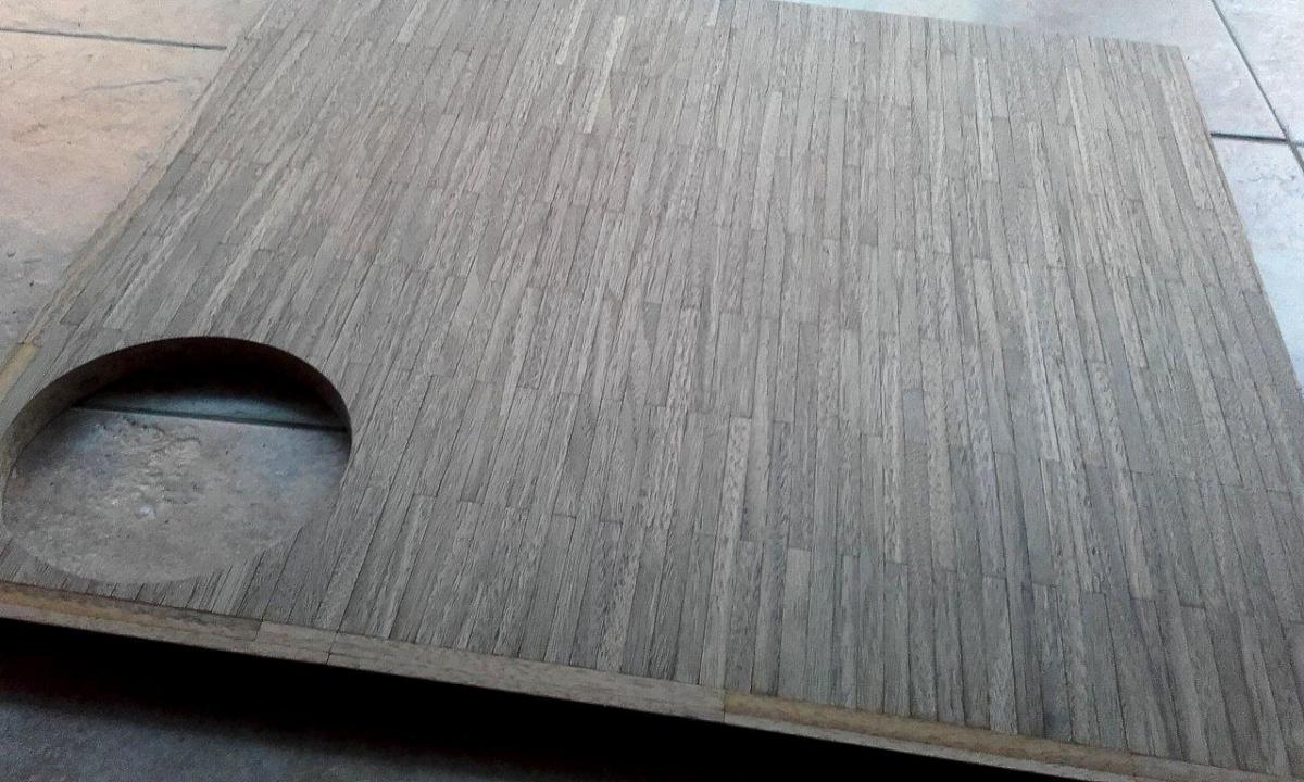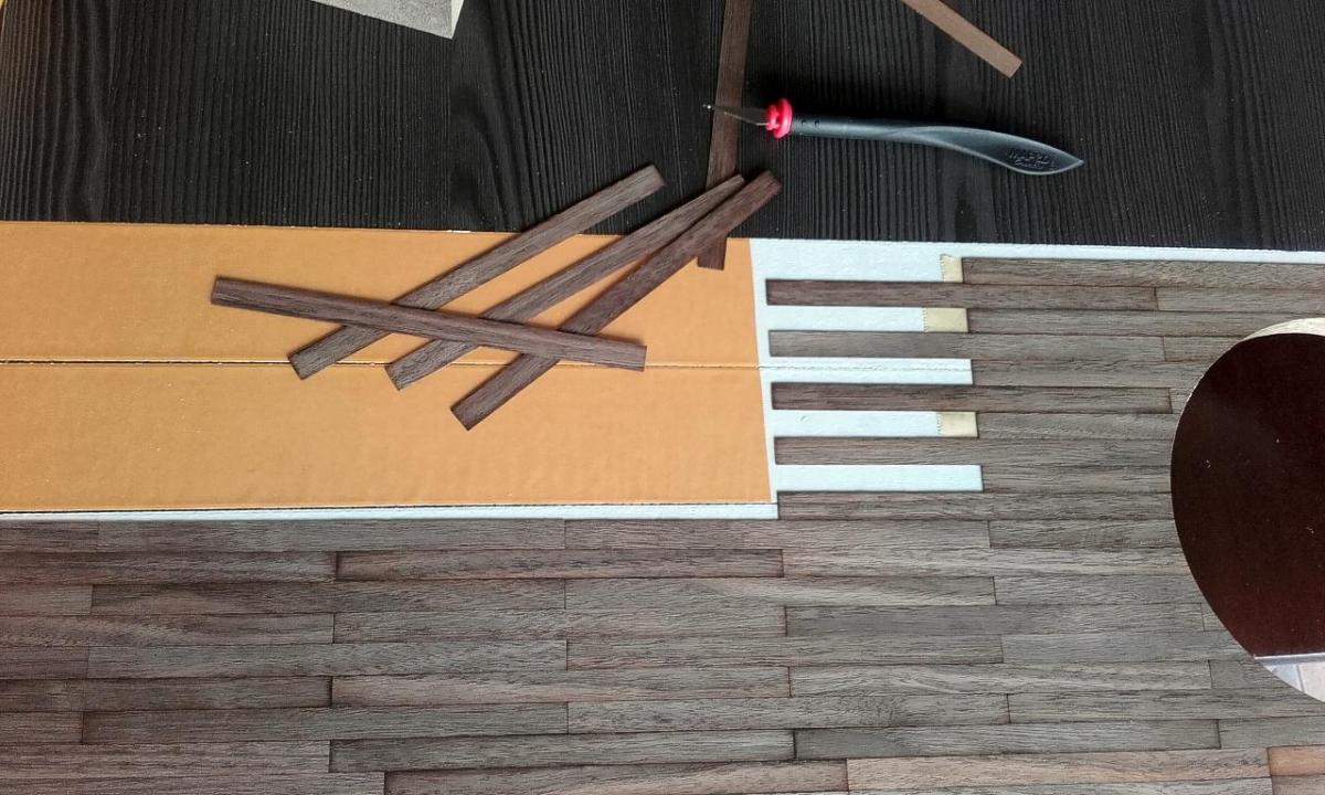 286 κομμάτια καπλαμά καρυδιάς κόπηκαν στο laser και κολλήθηκαν (3.5 ώρες) στο δάπεδο του μπαρ. Χρησιμοποίησα αυτοκόλλητη ταινία διπλής όψης 3Μ. Αυριο τρίψιμο και βερνίκι -
