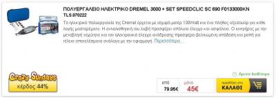 9. Απίστευτη είναι η τιμή για το πόσο αγοράζεις το Dremel 300 και στην συγκεκριμένη είναι 28€ Την αρχική τιμή πότε δεν την υπολογίζω.... συνήθως είναι η προτεινόμενη λιανική ή κάτι κοντά εκεί. Στην συγκεκριμένη περίπτωση ξέρω ότι τα εξαρτήματα κοστίζουν στο skroutz 17€ Oπότε 45-17 = 28 ευρώ παίρνεις το Dremel 300 Τα εξαρτήματα έχουν 16.89€ https://www.skroutz.gr/c/961/spare-parts.html?from=catspan&keyphrase=Σετ+Εξαρτημάτων+EZ+SpeedClic