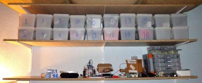 Κάτι που είχα σκεφτεί πριν αρκετά χρόνια, και επιτέλους έκανα πραγματικότητα κάποια στιγμή. Πήρα από σουπερ μάρκετ πλαστικά τάπερ που είχαν τυροσαλάτα, ρώσικη κ.τ.λ. και όταν τελείωσαν τα είχαν για πέταμα. Τα καθάρισα, τα έβαλα αριθμούς, και έβαλα μέσα τα αντικείμενα που ήθελα. Οι διαστάσεις τους είναι 24 χ 16 χ 14 ύψος. Τέλεια διάσταση για ένα ράφι 25-30 εκατοστών. Αφού γέμισα το τάπερ, έβγαλα τα αντικείμενα έξω και τα φωτογράφισα. Μετά εκτύπωσα τις φωτογραφίες, και έγραψα από πίσω τον αριθμό του τάπερ. Πλέον όταν ψάχνω κάποιο αντικείμενο παίρνω τις φωτογραφίες και όταν το βρω βλέπω τον αριθμό και παίρνω το αντίστοιχο τάπερ -