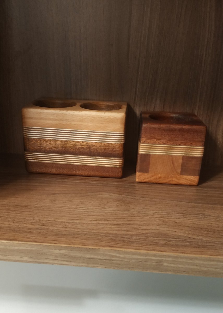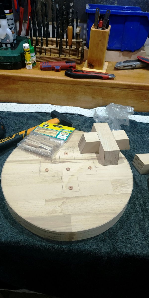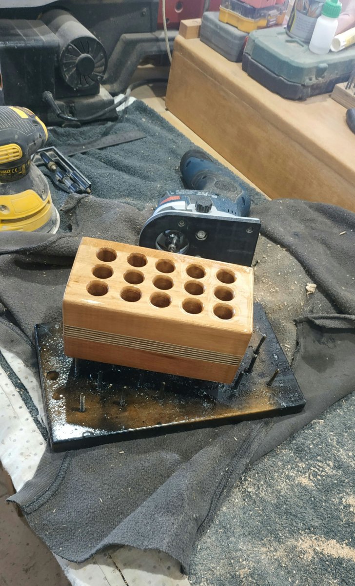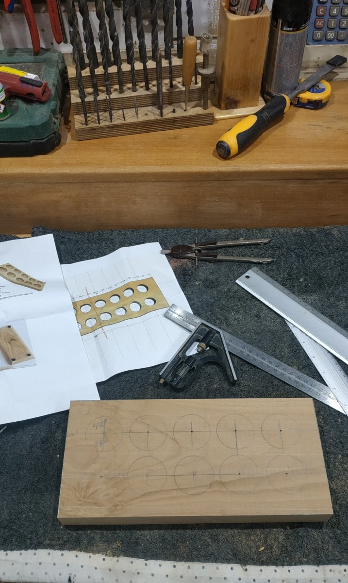 Καλό βράδυ από την Πάτρα. Συνέχεια μικρών κατασκευών για δωράκια. Κολλήθηκαν μεταξύ τους ότι διαθέσιμα ρετάλια ξύλου υπήρχαν στο Εργαστήριο. Οι τρύπες έγιναν στο εξαίσιο για τέτοιες περιπτώσεις κολωνάτο δράπανο της Bosch. Οι στροφές είχαν ρυθμιστεί στις 330 rpm, με διάμετρο Forstner τρυπανιού 60 mm!!! Το βάθος των οπών έφτασε στα 70 mm.