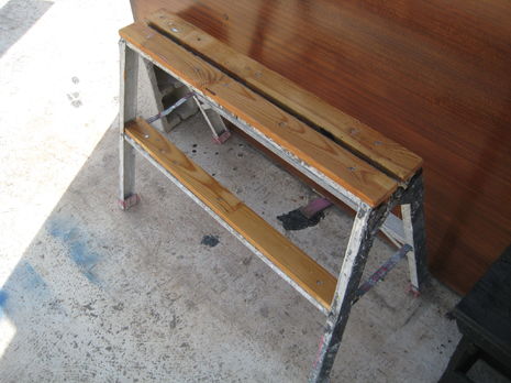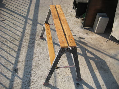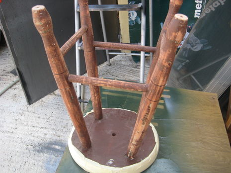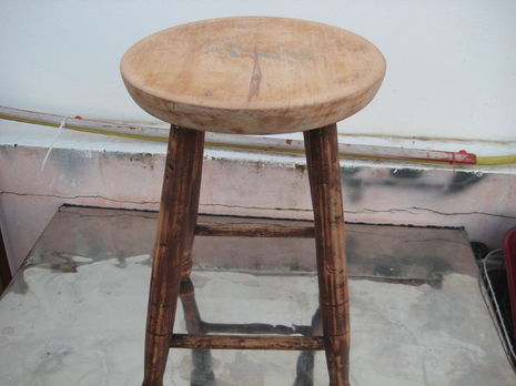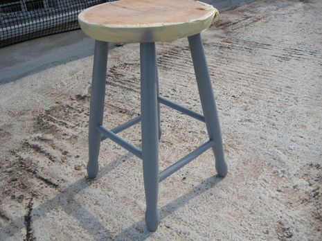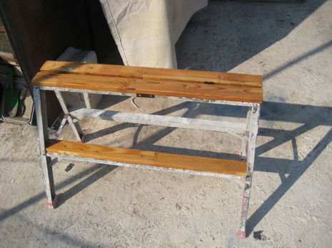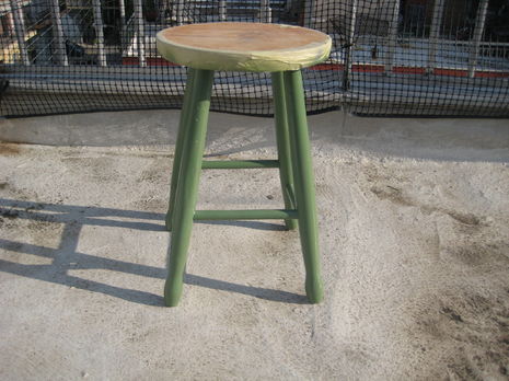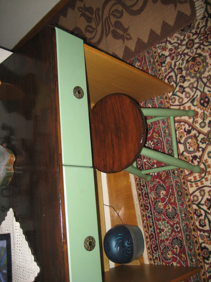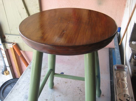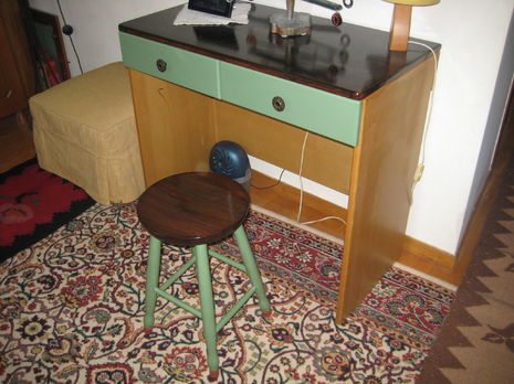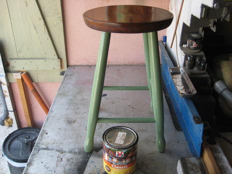 Πεταμενο σκαμπουδακι, βαμμενο με μια αθλια μπογια,[στην πραγματικοτητα σοβατισμενο] αλλα χωρις αλλο προβλημα.... Τριφτηκε καλα το πανω μερος, στα ποδια λιγοτερο , [θα βαφτουν] κ αρκετη απ την παλια μπογια εμεινε εν ειδη στοκου.... Τα ποδια ασταρωθηκαν, τριφτηκαν ελαφρα κ βαφτηκαν με σπρευ που ειχε περισσεψει απο παλιοτερα.... Πανω περαστηκε 2 χερια εμποτισμου.... Τελος περαστηκε ολο ενα βερνικι που ειχα ,για να γινει ποιο ανθεκτικο σε τυχον μικροχτυπηματα.... Μπηκαν βιδωτα στα ποδια... Κ σεταριστηκε με το μικρο ,μασιφ, γραφειακι που επισης ειχε βρεθει πεταμενο....