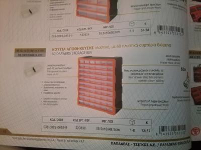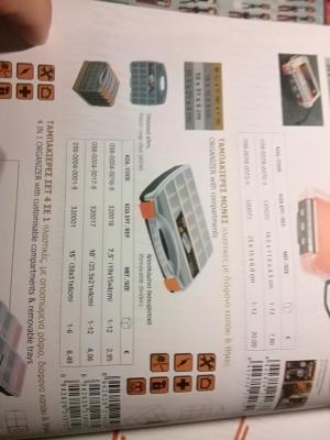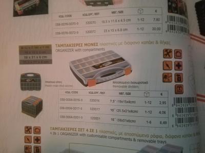 Το μικρό (ή το μεγάλο) μου εργαστήριοZoSo απάντησε στο θέμα του karmen1983 topic στην ενότητα Το στέκι του μάστορα Το ετερον ημισυ χρησιμοποιει αυτες για να βαζει μεσα χαντρες, κουμπωματα κλπ απο κοσμηματα που φτιαχνει. Προσωπικα θα τις προτιμουσα απο τις Stanley λογω τιμης/αποδοσης. Πολυ καλη ποιοτητα, ο μονος λογος να προτιμησεις τις Stanley ειναι για να μπορεις να βγαζεις τα σκαφακια με ο,τι εχουν μεσα. Οι tactix εχουν αποσπωμενα τοιχωματα μονο που μπορεις να φτιαξεις οπως θες τις θηκες αλλα δεν εχουν πατο για να μπορουν να βγαινουν οπως ειναι. Το βραδυ θα στειλω και τα υπολοιπα μεγεθη απο τον καταλογο γιατι δεν τον εχω μαζι μου τωρα.