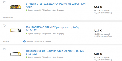 Καλησπέρα,σήμερα έκανα μια βόλτα από Σπύρου Πάτση καθώς ήμουν κοντά και χρειαζόμουν ένα σιδεροπρίονο. Ξεκίνησα τη διαδρομή από Ιερά οδό , οπότε από τα πρώτα μαγαζιά που βρήκα ήταν στην οδό Σ.Πατση 33 ο Γκίοκας-Μαργέτης. Άρχισα να κάνω μια βόλτα για να χαζέψω, και αν εξαιρέσουμε ότι ήταν όλη την ώρα απο πίσω μου (και δεν με άφησαν να κλέψω ένα παλμικό της dewalt που είχα βαλει στο μάτι ) μου πρότειναν το συγκεκριμένο Stanley της φωτογραφίας: Για αυτό μου ζήτησαν 7 ευρώ Για να ρίξουμε και μία ματιά καισ το ιντερνετ για το συγκεκριμένο πριόνι: 3 ευρώ κάτω δηλαδή. Ας πούμε οτι έπαθα και έμαθα. Σίγουρα δέν είναι ο κανόνας, αλλά μάλλον η εξαίρεση σε αυτό που λέμε εδώ οτι "από κοντα θα βρεις καλύτερες τιμές " Οπότε μάλλον πρέπει να κοιτάω την επόμενη φορά καλύτερα και online πριν κάνω κάποια αγορά... στα του εργαλείου τώρα, το πριόνι κόβει ικανοποιητικά (2 βιδες έκοψα)και τις πρώτες φορές μάλλον, θα γεμίζει το κόσμο με τη κόκκινη μπογιά της λάμας η οποία όσο κόβεις φέυγει- 2.258 απαντήσεις
