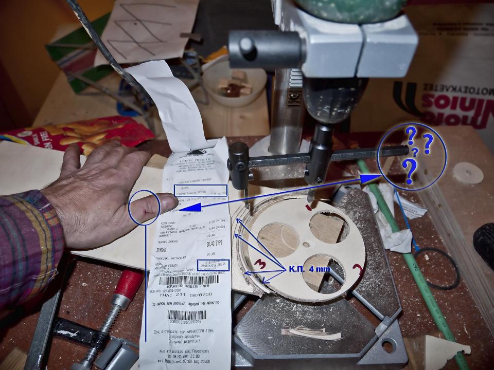 9. Το οριακά μεγαλύτερο, είναι μέσα στα πλαίσια της ρύθμισης. Υποτίθεται ότι σφίγγει εκεί. Και έχει και διπλή ασφάλεια. Μία κόπιτσα και ένα σταθερό κεφάλι. Αλλιώς ας τού έβαζαν ένα ίδιο περιορισμό ασφαλείας. Το απόλυτο δίκιο να έχεις, πάλι λάθος τους είναι. Όχι δεν το είχα στερεώσει, αλλά δεν κουνήθηκε καθόλου. Το τρυπάνι ήταν, που μάλιστα ξεβιδώθηκε στα μισά και αναγκάστηκα να το ξανασφίξω. Άσε που πριν ακουμπήσει ξύλο, το έβγαλα - έβαλα, τουλάχιστον 10 φορές και άλλαζα τις 2 μύτες του, εναλλάξ, διότι χόρευε. Αυτό δεν έπαιξε ρόλο όμως, επειδή απλά μεγάλωσε η κεντρική τρύπα. Μετά η ευθύνη ήταν στα ακριανά. Ναι όντως, έβαλα το χέρι εκεί κοντά. Όπως και στις 40άρες τρύπες και σε κάποιες άλλες δουλειές. Λάθος. Ακόμα και αν υποθέσουμε όμως ότι κουνήθηκε το χέρι, μιλάμε για 1 χιλιοστό κόντρα πλακέ που είχε απομείνει. Αν πάμε με αυτό σενάριο, δικαιολογεί το σπάσιμο της βίδας, το σπάσιμο της ασφάλειας και το πέρασμα μέσα από το σταθερό κεφάλι ; Τίποτα από στροφές. Το είχα στις αμέσως επόμενες από εκεί που δυσκολευόταν. Και είναι το καλό μοντέλο τής Wolfcraft με τα 100 ευρώ.