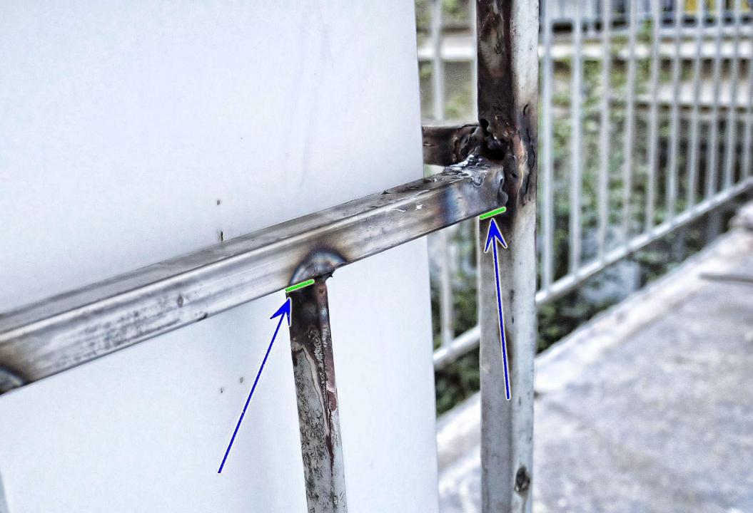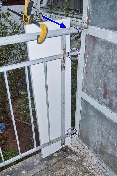 Αποφάσισα να αλλάξω τα κάγκελα στο μπαλκόνι και πρέπει να μην ξεφύγω πολύ από την εμφάνιση των γειτόνων. Λάμες θα βάλω ίδιες (16 Χ 5). Στη θέση των 17 Χ17 στραντζαριστών, θα βάλω μασίφ 16 Χ 16. Όμως αντί για πεντάγωνη κουπαστή 53 Χ 30, θα βάλω παραλληλόγραμμη κοιλοδοκό 50 Χ 30 Χ 3. Η ένωση με τα στραντζαριστά του διπλανού (τα κυκλάκια στη φωτο) θα ενισχυθεί με μασίφ 10 cm μέσα στην τρύπα, προκειμένου να μην λιώνει στην κόλληση με το δικό μου μασίφ. Όμως θέλω συμβουλές - ιδέες για την κουπαστή. Είναι 50 ετών στραντζαριστή και μάλλον 1,5 mm. Να της κόψω λίγο τις γωνίες, σε έκταση 5 πόντους ; Πώς να την ενισχύσω εσωτερικά ; Με λίγο τετράγωνο βαρέως τύπου ; Με λάμες ;