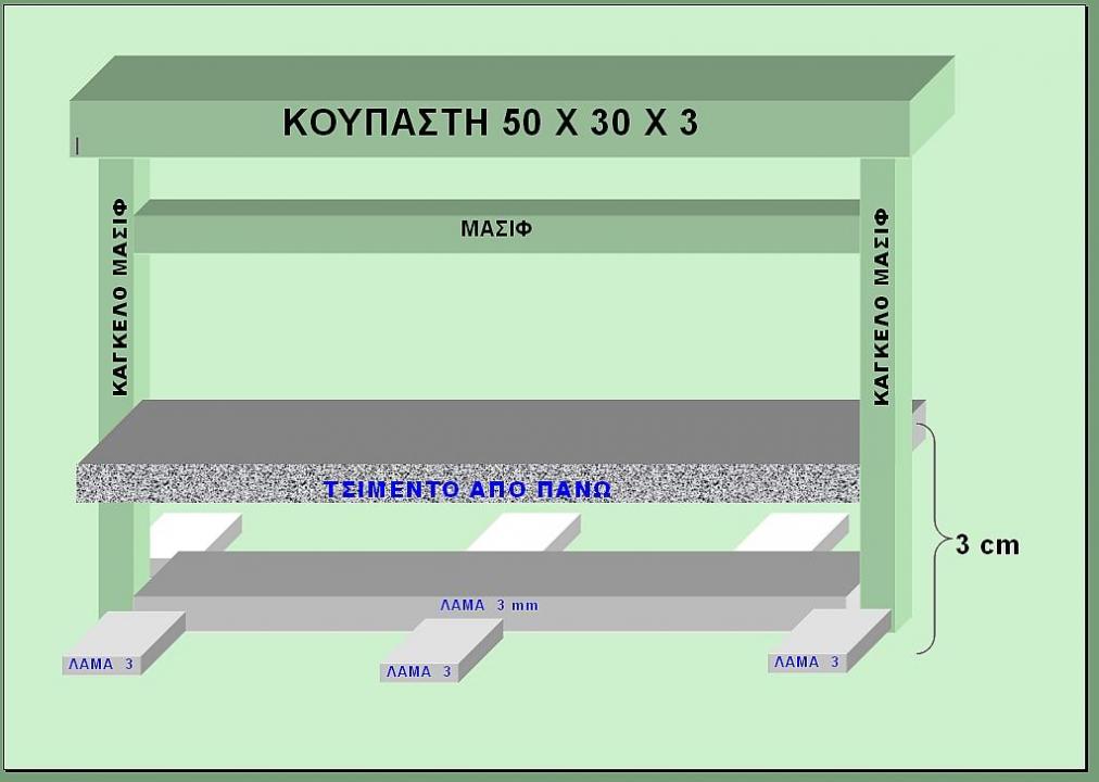Ωραίος ! Θα το "ψευτο-κολλήσω'" για να μην έχει να πει ο δίπλα ότι τού στερώ την υποστήριξη. Ουσιαστικά όμως, θα τραβήξω 2 αντιρίδες από λάμα 4mm, κολλητά με το μέταλλο του τζαμιού, μέχρι πίσω στον τοίχο. Μία εκεί που είναι το Dexion και μία κάτω-κάτω. Διακριτικά, σαν μέρος του τζαμιού χωρίς να φαίνεται η σπουδαιότητά τους. Μάλλον με 1-2 τσιμπίματα - πόντες κάθε 10 εκατοστά, για να μην σπάσει το τζάμι από τη θερμοκρασία. Για την στήριξη των μασίφ, δεν θα υπάρξει πρόβλημα, επειδή (δες φωτό) κατάργησα το φιλέτο από το Μάρμαρο (για λόγους βάρους) και έχω 3 cm, στα οποία μπορώ να βάλω λάμες με ποδαράκια και από πάνω τσιμέντο. Για τις τρύπες, έχω πάρει την εποξειδική 2 συστατικών από την NEOTEX (1 κιλό ρευστή και 1 κιλό στοκο-ειδή). Ή εποξειδική, με τις καλοκαιρινές θερμοκρασίες του σίδερου μαλακώνει κάπως και δεν αφήνει να ραγίσει το τσιμέντο από τις διαστολές. Λειτουργεί και ως αμορτισέρ. Όμως με τις λάμες που θα μπούνε κάτω στις βάσεις (όπως στην φωτό), θα πρέπει αναγκαστικά να φύγει όλο το ακριανό μπαλκόνι 250 Χ 15 εκατοστά, για να μπορέσει να πάθει ζημιά. Θα μπορούσα να μην το είχα προβλέψει όμως και σε ευχαριστώ πολύ για τις πολύτιμες συμβουλές σου. -
