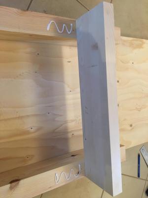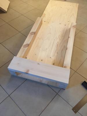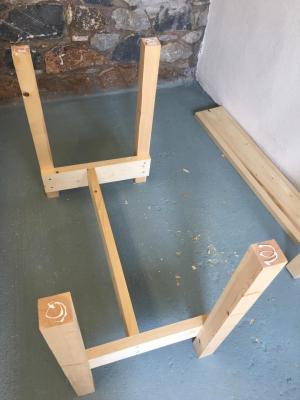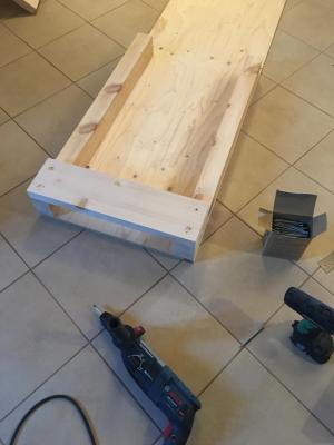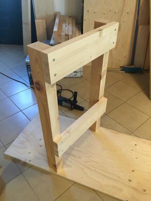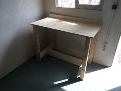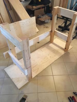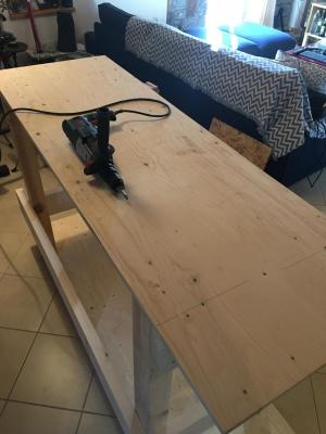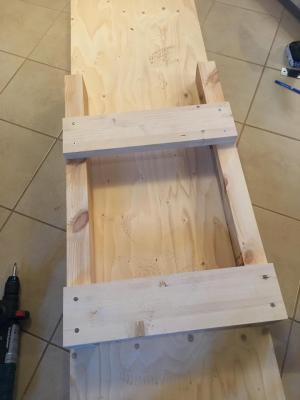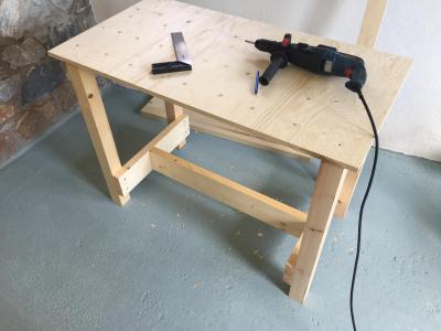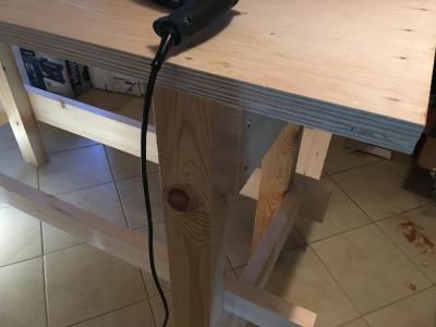 Τελευταίος πάγκος , ο πάγκος-γραφείο. Πιο απλή κατασκευή, για πιο λεπτοδουλειές, ηλεκτρονικά κτλ.... Το σχέδιό του. Εδω ήθελα και κάτι να ακουμπούν τα πόδια, γιατι εδω κυρίως θα δουλεύω καθιστός: Τα ξύλα του: Βίδωσα τα πλαινά στα πόδια: Μετά σημάδεψα και βίδωσα ενα μεσαίο ξύλο, το οποίο δένει όλη την κατασκευή, αλλα και χρησιμεύει να ακουμπάς τα πόδια σου όταν κάθεσαι: Αυτή είναι η κάτω πλευρά του κόντρα πλακέ, όπου σημάδεψα που ακριβώς πάνε τα πόδια: Έβαλα κόλλα (όπως πάντα) στα πόδια: Ακούμπησα πάνω το κόντρα πλακέ και κοιτώντας απο κάτω έβαλα απο μια βίδα σε κάθε πόδι. Βιδώνοντας ενα-ενα τα πόδια, δε γίνεται να χάσουμε τα σημάδια μας, οπότε αναγκαστικά τα ξύλα του θα είναι όλα παράλληλα μεταξύ τους: Τέλος βάζωντας και το πίσω ξύλο: Μπροστά ξύλο δε χρειάζεται εδώ, γιατι είναι για ελαφριές εργασίες και το κόντρα πλακέ θαλάσσης των 2 πόντων, δε λυγίζει με τίποτα. Αν χρειαστεί όμως στο μέλλον μπορώ να προσθέσω ενα κρυφό στήριγμα κάτω απο το κόντρα πλακέ, που θα ενώνει τα δύο μπροστινά πόδια.....Νάτο και το γραφειάκι: Ως αυτό το στάδιο έχω φτάσει μέχρι τώρα. Στη συνέχεια θα ζυγίσω και θα βιδώσω τους πάγκους, θα βάλω τα εργαλεία στον τοίχο κτλ....Αν υπάρχουν ιδέες, σχόλια κτλ, εκφραστείτε ελεύθερα...! -