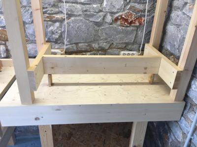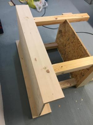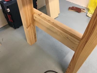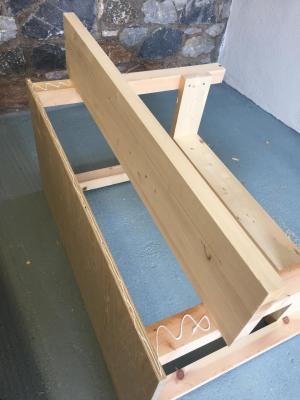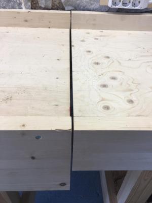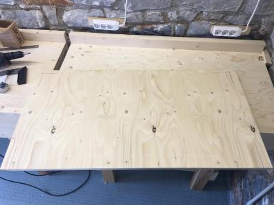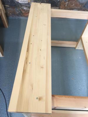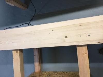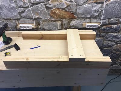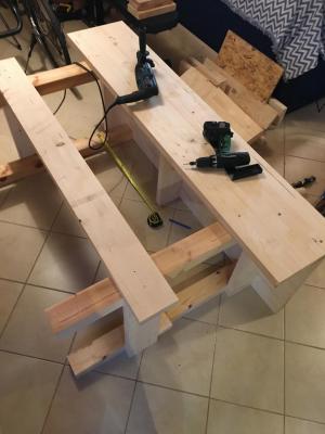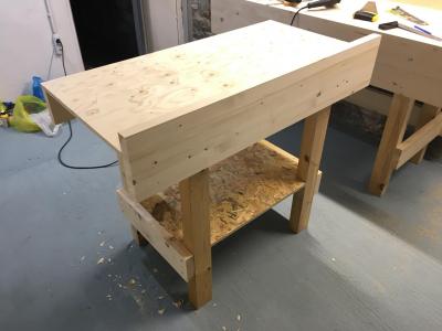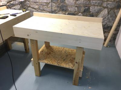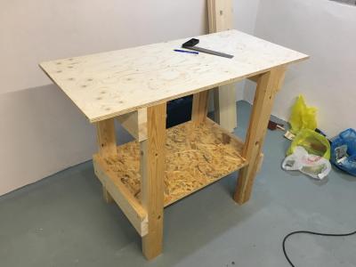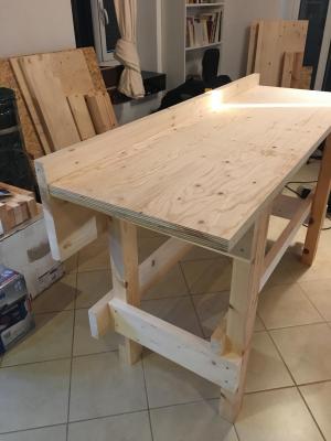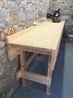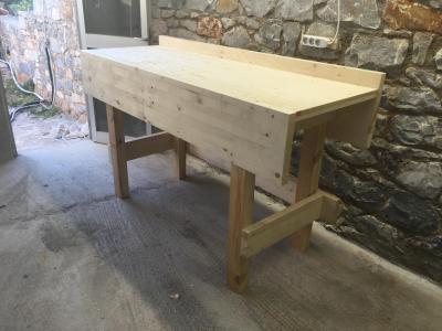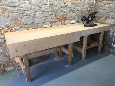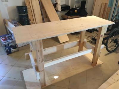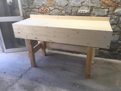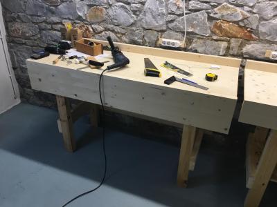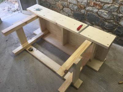 Εν συνεχεία ο δεύτερος πάγκος. Πάνω σε αυτό τον πάγκο θα ακουμπήσω μηχανήματα, όπως φαλτσοπρίονο, επιτραπέζιο δράπανο κτλ... Αυτό είναι το (πρόχειρο) σχέδιό του: Αυτά είναι τα ξύλα του. Τα πίσω κομμάτια OSB που φαίνονται δεν είναι για τον πάγκο, αλλα για να στηριχθούν τα εργαλεία στον τοίχο: Πλέον δουλεύω πάνω στον πάγκο (ευτυχώς για τη μέση μου!) και βιδώνω το κάτω και το πάνω πλαινό στα πόδια: Μετά σημάδεψα το καπάκι του απο την κάτω πλευρά και βίδωσα με οδηγό αυτά τα σημάδια, πρώτα τα δύο πόδια και μετά τα άλλα δυο πόδια. Εδω επειδή έχουμε ενα κόντρα πλακέ και όχι δύο, όπως στον προηγούμενο πάγκο, βίδωσα τις βίδες λίγο πιο βαθιά και θα βάλω στο τέλος λίγο στόκο και θα τρίψω όλο τον πάγκο με ήπιο γυαλόχαρτο: Έκοψα ενα κομμάτι OSB για να μπεί κάτω απο τον πάγκο ως ράφι. Αυτός ο πάγκος επειδή θα έχει μόνο σταθερά μηχανήματα, δε χρειάζεται να έχει "αέρα" απο κάτω, γιαυτό και του βάζω ενα ράφι. Ο μεγάλος πάγκος επειδή έχει μέγγενη και πολύ δουλειά στο χέρι, καλό είναι να έχει κενό απο κάτω του, για να μπαίνουν τα πόδια και να κάνουμε βαριές δουλειές: Και επειδή υπολόγισα λάθος το μήκος του ραφιού, έβαλα ενα πηχάκι στα πλαινά και ακουμπάει εκεί. Κανονικά το σχέδιο ήταν να ακουμπάει πάνω στα πλαινά, αλλα λεπτομέρειες.... Πήρε μορφή και αυτός ο πάγκος, μένουν τα μπροστά-πίσω ξύλα: Εδω έριξα κάτω τον πάγκο και βίδωσα το πίσω ξύλο, αφήνοντας πάλι 7 εκατοστά εξόγκωμα προς τα πάνω: Τελευταίο το μπροστινό ξύλο, πάλι με την ίδια λογική: Έτοιμος ο μικρός μας πάγκος! Είναι λίγο πιο χαριτωμένος απο τον άλλο που είναι θηρίο! Και οι δύο μαζί τοποθετημένοι στον τοίχο. Τώρα χρειάζεται ζύγισμα για να είναι οριζόντιοι και βίδωμα στον τοίχο: Η συνέχεια σε λίγο με τον πάγκο ηλεκτρονικών, για λεπτοδουλειές... -