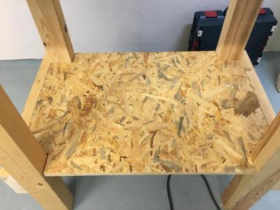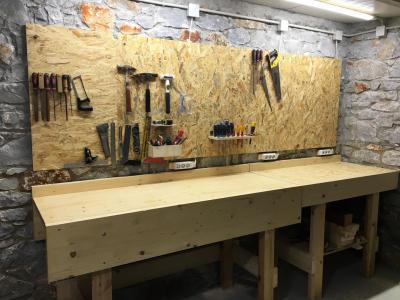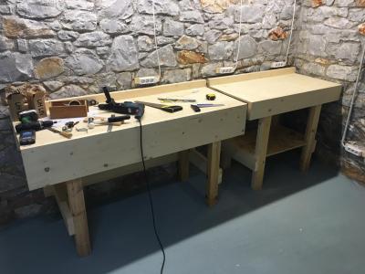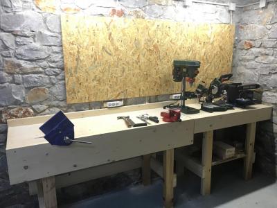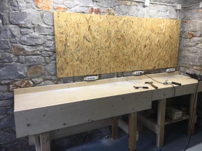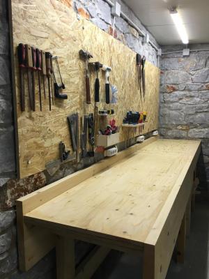 Επιτέλους σήμερα κατάφερα και έτριψα τους δύο πάγκους. Τους έτριψα με παλμικό τριβείο και με 120 γυαλόχαρτο. Μετά τους πέρασα ενα βερνίκι εμποτισμού πατωμάτων, για να αντέχουν τις ταλαιπωρίες. Αύριο θα τους περάσω και ενα δεύτερο χέρι... Συμπλήρωσα και ενα κομματάκι osb στον τοίχο, οπότε και οι δύο πάγκοι έχουν osb στον τοίχο απο πάνω τους. Έβαλα και μερικά εργαλεία στο osb... Οπότε σιγά-σιγά οι πάγκοι αρχίζουν και παίρνουν μορφή! -