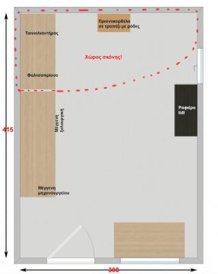 Καλημέρα και ευχαριστώ για την απάντηση... Ο αριστερός πάγκος είναι φτιαγμένος για χτυπήματα και γενικά κραδασμούς, γιαυτό και δεν θα ήθελα να βάλω πάνω του κάποιο σταθερό μηχάνημα, για να μη δέχεται τους κραδασμούς. Ο δεξιός έχει ενα κενό μισό πόντο περίπου απο τον αριστερό και είναι πιο ελαφρού τύπου, γιαυτό ήθελα να βάλω εκει πάνω τα σταθερά μηχανήματα. Έχεις όμως απόλυτο δίκιο οτι πρέπει να χωρίσω τα εργαλεία σε αυτά που κάνουν πολύ σκόνη (φαλτσοπρίονο, ταινιολιαντήρας, πριονοκορδέλα metabo). Γιαυτό έφτιαξα μια κάτοψη του εργαστηρίου, για να δείτε όλο το χώρο. Δυστυχώς είναι μικρός χώρος (4.15χ3.00), αλλα ελπίζω να βολευτούν όλα εκει μέσα: Όπως βλέπετε βάζω τη μέγγενη του μηχανουργείου πρώτα. Μετά βάζω την ξυλουργική μέγγενη. Αυτό το κάνω για να δώσω χώρο πάνω στον πάγκο, ώστε αν θέλω να κόψω ενα μακρύ ξύλο με το φαλτσοπρίονο, να έχω χώρο στα αριστερά. Επειδή η μέγγενη του ξυλουργού βιδώνει στα πλάγια-μπροστά του πάγκου και δεν πιάνει καθόλου χώρο πάνω στον πάγκο. Μετά βάζω τον ταινιολιαντήρα, γιατι βγάζει πολύ σκόνη. Πιο δεξιά, εκτός των πάγκων, θα φτιάξω ενα τραπεζάκι κινούμενο για να μπει η metabo πριονοκορδέλα. Έτσι δημιουργείται ενας χώρος που θα παράγεται σκόνη-πριονίδια, τον οποίο τον έχω κυκλώσει με διακεκομμένη κόκκινη γραμμή. Μετά βλέπετε μια ραφιέρα του lidl, που έχει μπει στο σημείο που θα ανοίγει το μικρό παραθυράκι. Και πιο κάτω τον μικρό πάγκο που θα είναι για ηλεκτρονικά και πιο ευαίσθητες δουλειές. Δεν έχω βάλει όμως πουθενά το δράπανο, δε μπορώ να σκεφτώ που θα ήταν η πιο κατάλληλη θέση...Φαντάζομαι πρέπει να μπει σε αυτόνομο τραπεζάκι, κάπου μακριά απο τη σκόνη ή έστω σε μια άκρη? -