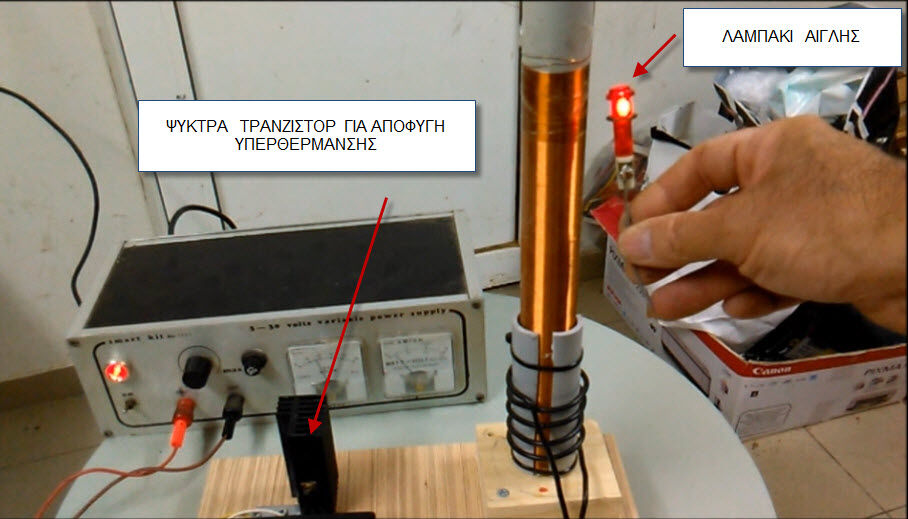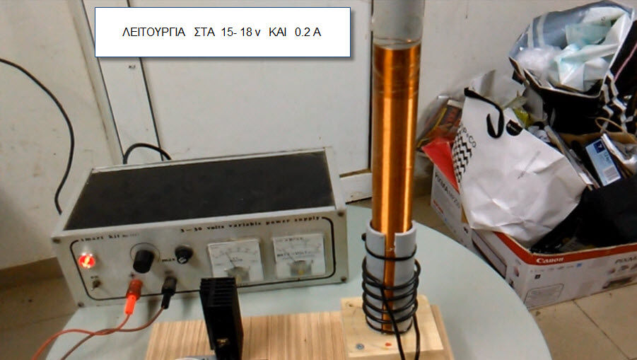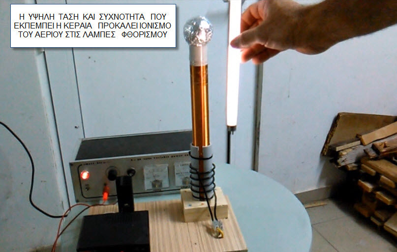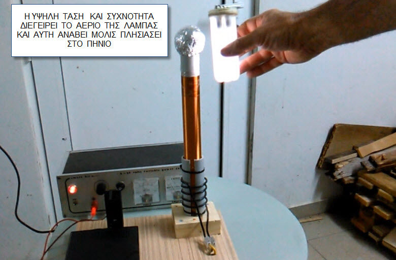 Μία κατασκευή που βασίζεται σε μία χαμένη εφεύρεση για ασύρματη μεταφορά ενέργειας από τον Nicola Tesla. Με ένα είδος ταλαντωτή από απλά υλικά παράγεται υψίσυχνη ταλάντωση (είναι ακίνδυνη) που διαχέεται σαμ ΗΜ κύμα στη ατμόσφαιρα πλησίον της κεραίας.Το αποτέλεσμα είναι να ανάβουν μόνες τους λάμπες φθορισμού και αίγλης μόλις πλησιάζουν στην κεραία. Πολλά fake trick τύπου FREE ENERGY έχουν κρυμμένο πηνίο tesla κάτω από το τραπέζι και πατώντας κάποιο ποδοδιακόπτη αναβοσβήνουν πάνω στο τραπέζι ως δια μαγείας λάμπες φθορισμού και οικονομίας. Ενημερωτικά παρόμοια πειράματα με λάμπες πυράκτωσης δουλεύουν με κρυμμένες επαγωγικές εστίες όπως αυτές που έχουν τα μάτια της επαγωγικής κουζίνας.Να μην σας κουράσω άλλο.
