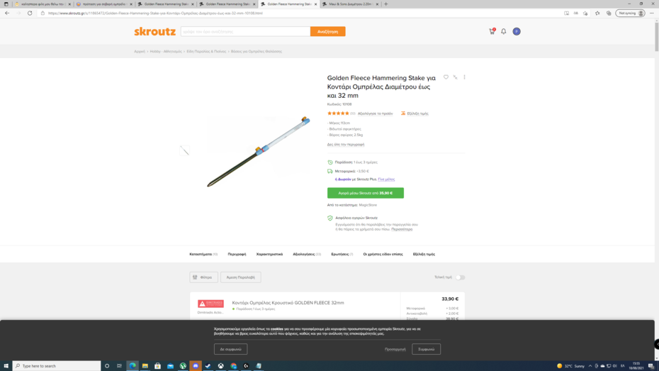οποτε σε αυτην https://www.skroutz.gr/s/23773453/Maui-Sons-Διαμέτρου-2-20m-UPF50-Γαλάζιο.html να παω σε Golden Fleece Hammering Stake για Κοντάρι Ομπρέλας Διαμέτρου έως και 30 mm 10106 - Skroutz.gr Golden Fleece Hammering Stake για Κοντάρι Ομπρέλας Διαμέτρου έως και 32 mm 10108 - Skroutz.gr; Πιο σαφε ειναι η 32; η να παω σε 30; βασικα εχω μπερδευτει με το κονταρια. και δεν θελω να παρω το λαθος κονταρι για την .2.20, και μετα πληρωσω πεταμενα λεφτα,. Υπαρχει περιπτωση η .2.20 να μην κανει στο κονταρι των 28 και να κανει στο 30 και 32; αυτα τα 3 κονταρια υπαρχουν -