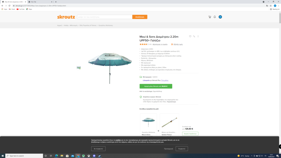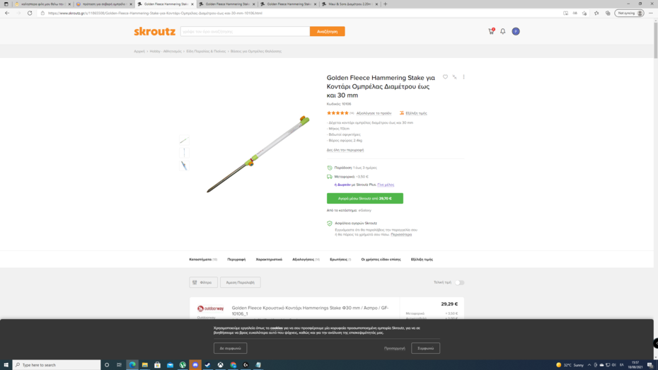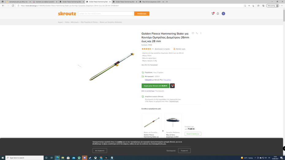για την https://www.skroutz.gr/s/23773453/Maui-Sons-Διαμέτρου-2-20m-UPF50-Γαλάζιο.html να παρω για δοκαρι αυτο; Golden Fleece Hammering Stake για Κοντάρι Ομπρέλας Διαμέτρου έως και 30 mm 10106 - Skroutz.gr η να παρω αυτο που μου προτεινες; Σαν ομπρελλα στο θεμα αερα και ακτινων , και σκιας ειναι αρκετα καλη; H 2.20m ποσα ατομα χωραει; για 2 ατομα ειναι αρκετα καλη; Στο αμαξι μου θα χωραει; εχω ενα opel astra του 2005 με την 28αρα βαση δεν ειχες κανενα προβλημα με την ομπρελα; επειδη στην περιγραφη λεει Άξονες 28/32mm για την Maui & Sons Διαμέτρου 2.20m UPF50+ Μπλε