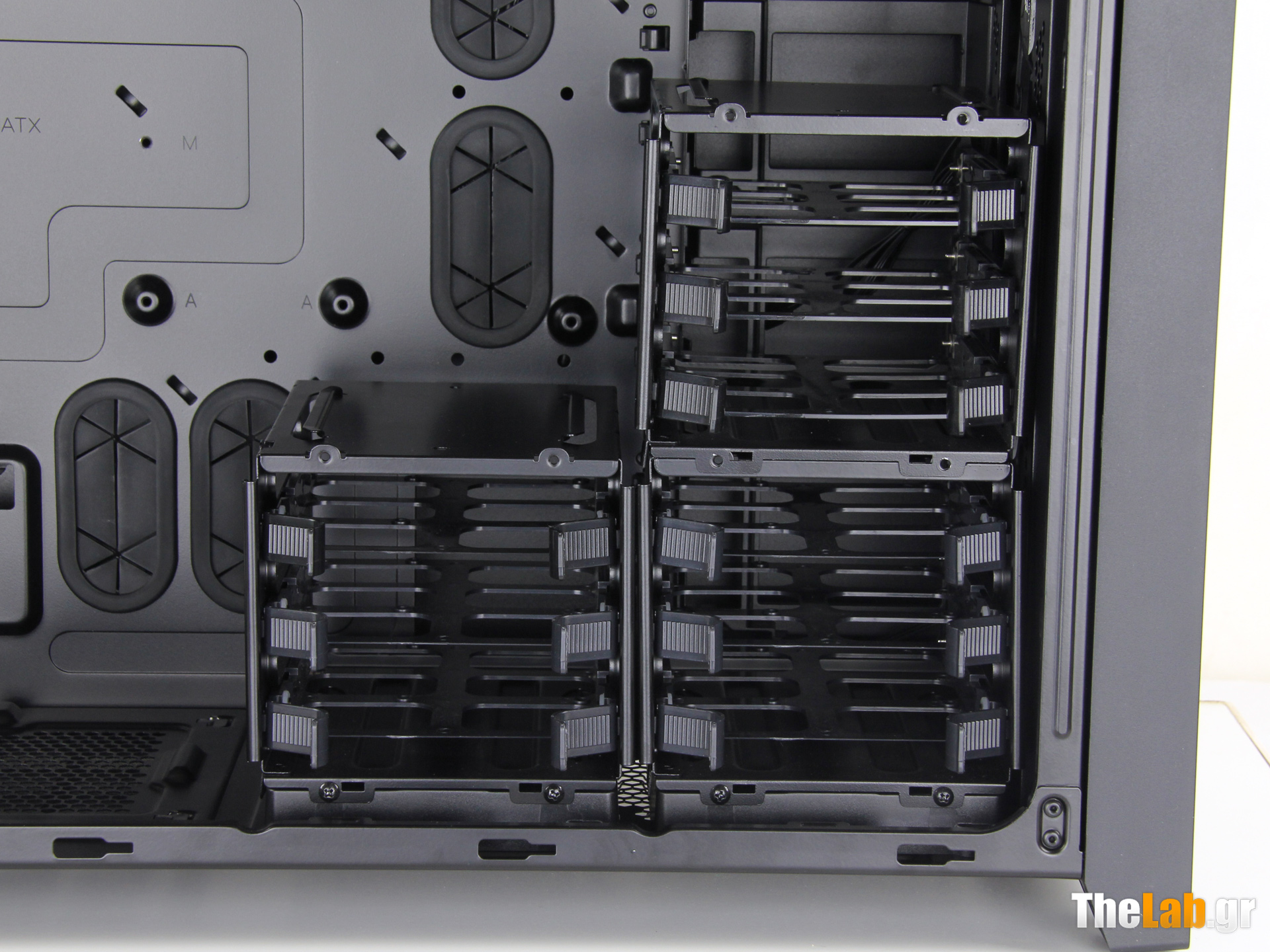 Τα συρτάρια των σκληρών δίσκων είναι έτοιμα να υποδεχτούν είτε 3,5" δίσκους (με tool free εγκατάσταση), είτε 2,5" δίσκους με την χρήση βιδών.Άξια αναφοράς είναι η ελαστικότητα τους αλλά και οι πίροι στήριξης, οι οποίοι δεν πατάνε απευθείας στο πλαστικό -που θα μπορούσαν-, αλλά υπάρχει ένα ειδικό ελαστικό παρέμβυσμα , το οποίο εξασφαλίζει την μέγιστη απόσβεση των υψίσυχνων δονήσεων, που παράγει ένας δίσκος.Το γεγονός αυτό, συν το ότι οι πίροι έχουν ένα μικρό τζόγο, εγγυώνται την απορρόφηση οποιουδήποτε κραδασμού!