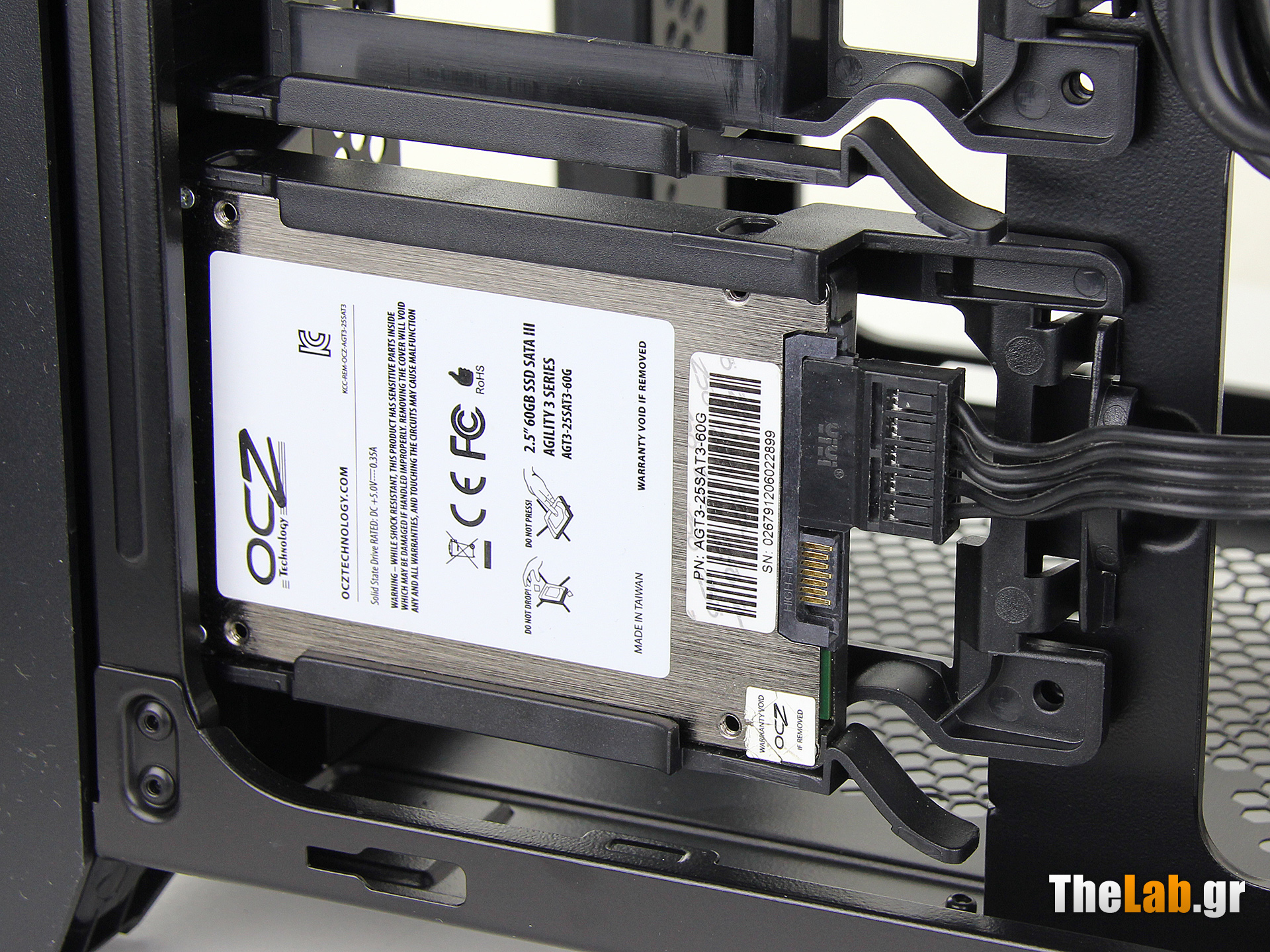 Ο δίσκος 3,5" εγκαταστάθηκε κλασικά με τον tool free μηχανισμό -όπως έχουμε δει πολλές φορές- και ο ssd πήρε και αυτός τη θέση του στο πίσω μέρος του κουτιού.Εδώ αξίζει να επισημάνουμε ότι αν έχετε πάνω από ένα δίσκο 2,5", τότε θα συναντήσετε πρόβλημα, στη περίπτωση που θα επιλέξετε να τροφοδοτήσετε τους δίσκους σας, από ένα καλώδιο τροφοδοσίας. Αυτό καθώς τα καλώδια που περνάνε από τα ενδιάμεσα power sata βύσματα, δε θα επιτρέψουν στο πλαϊνό να κλείσει.Καλό θα είναι σε τέτοια περίπτωση να χρησιμοποιήσετε δύο καλώδια από το τροφοδοτικό σας, αξιοποιώντας τα τερματικά power sata βύσματα.