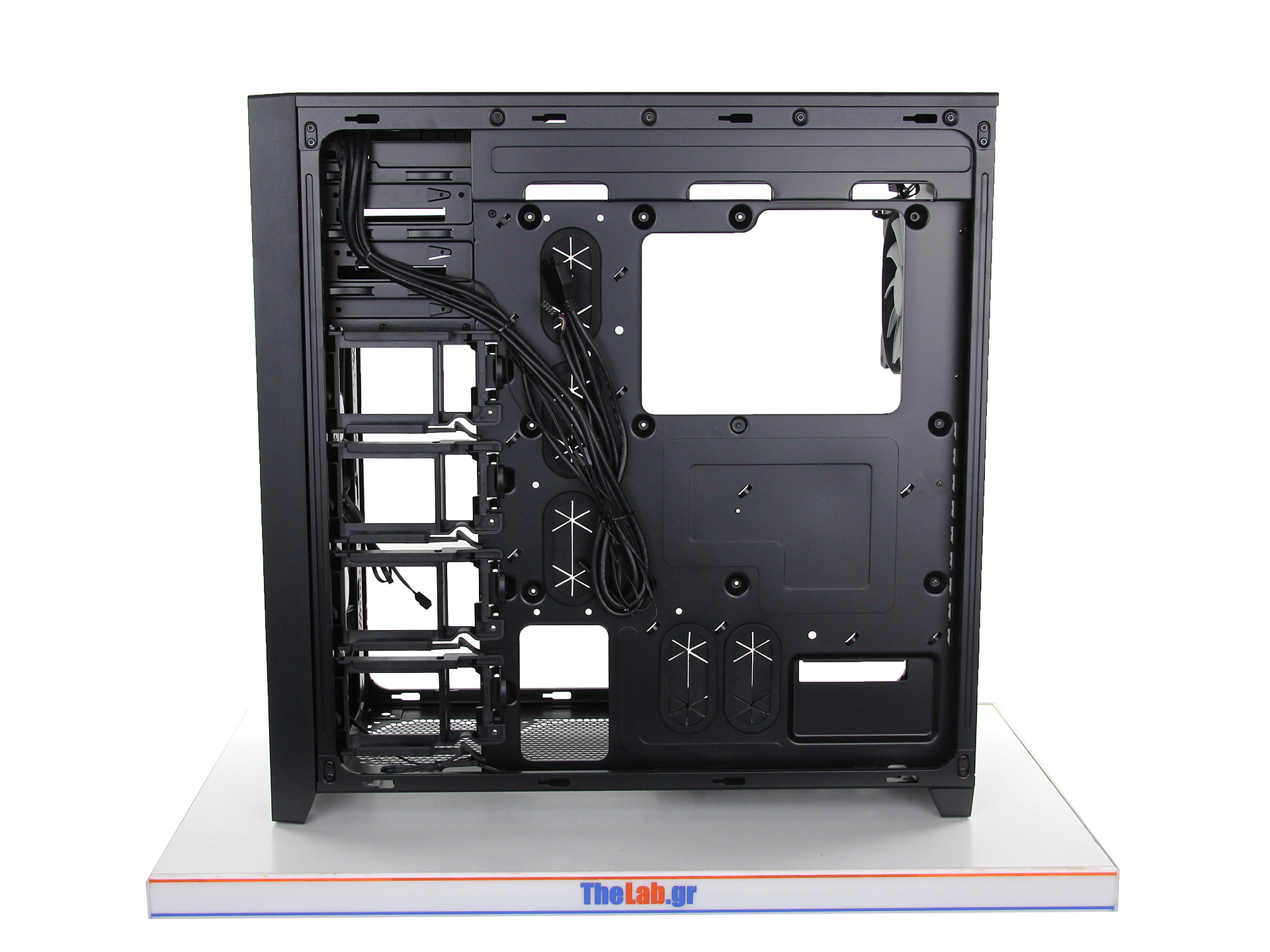 Το αφήσαμε σε μία άκρη και ρίξαμε την πρώτη ματιά στο εσωτερικό του Corsair Obsidian 750D.Αυτό που αντικρίσαμε ήταν ένα κατάμαυρο εσωτερικό, με πολλές θέσεις για το πέρασμα καλωδίων -εξοπλισμένες με grommets- έξι θέσεις για δίσκους, τους tool free μηχανισμούς στις θέσεις 5.25" και κάτι νέο που έχει να κάνει με θέσεις για 2.5" δίσκους στο πίσω μέρος.