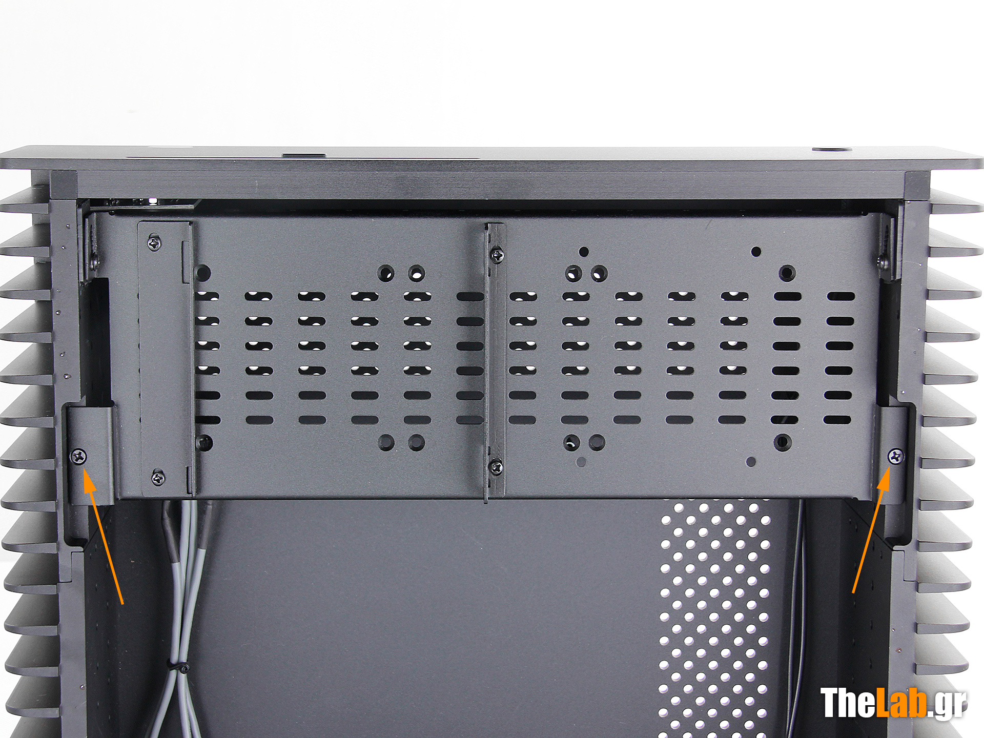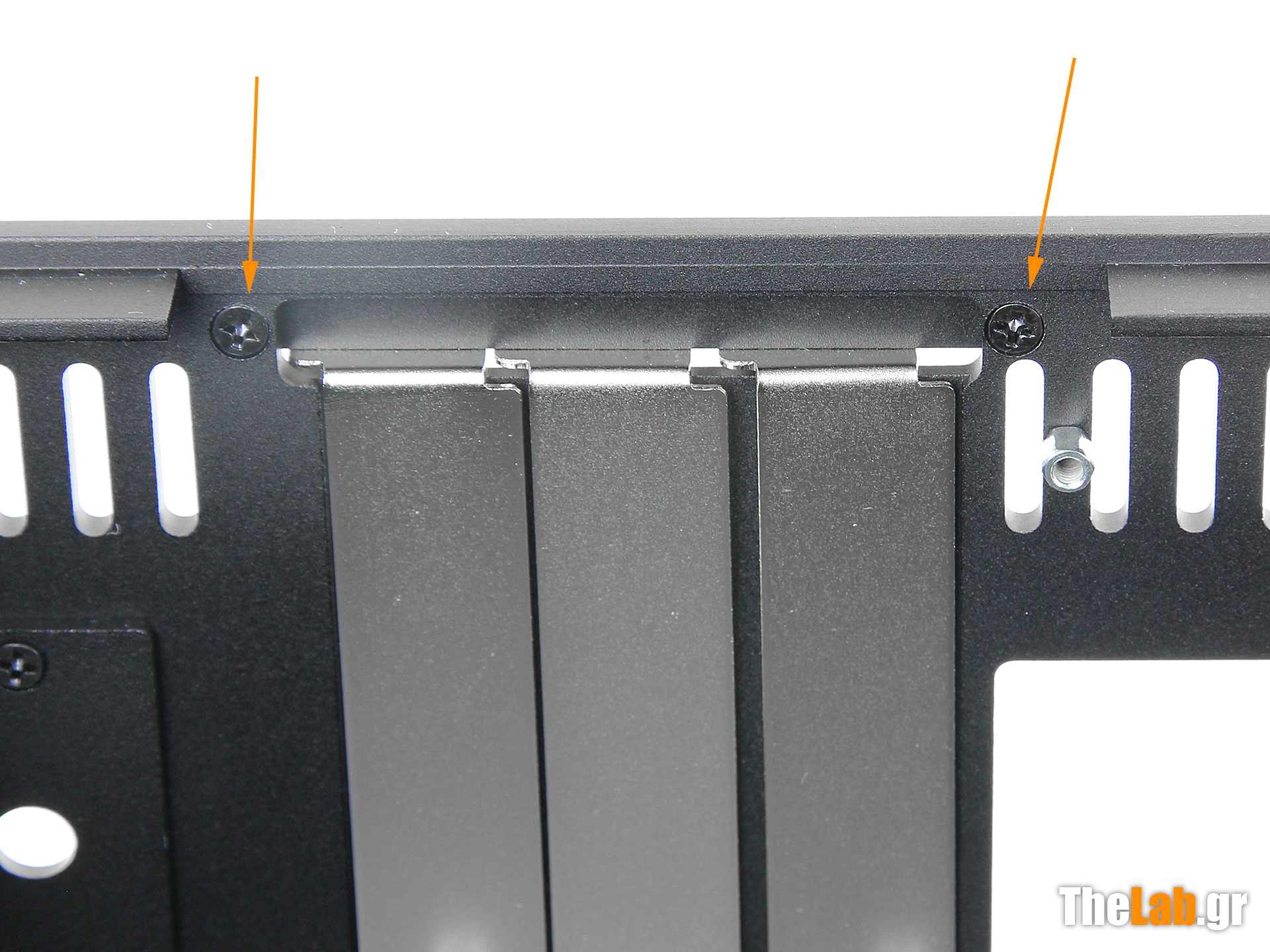 Αρχικά οι δύο βίδες που υπάρχουν στο επάνω μέρος μαζί με άλλες δύο στο δεξιό πλαϊνό, είναι αυτές που κρατάνε στη θέση τους την οροφή του κουτιού. Οι δύο βίδες που φαίνονται στο κέντρο συγκρατούν τα δύο κομμάτια μετάλλου από τα οποία αποτελείται το heatsink, ενώ τον τρόπο ένωσής τους, θα τον δούμε κατά τη πλοήγησή μας στο εσωτερικό του κουτιού.