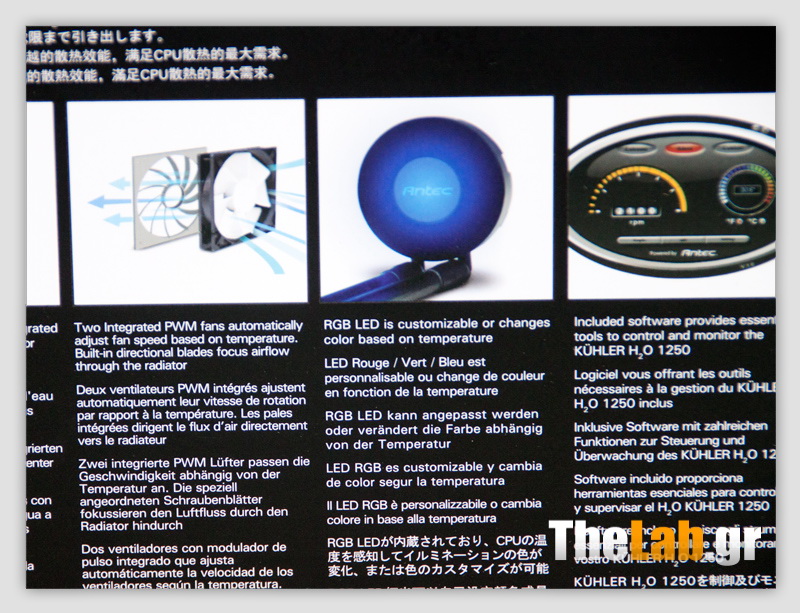 Στο πίσω μέρος του κουτιού η Antec παραθέτει μέσω φωτογραφιών, γραφικών και κειμένου τα σημαντικότερα χαρακτηριστικά της Kuhler 1250. Αυτά περιλαμβάνουν τον ειδικά σχεδιασμένο πάτο του μπλοκ, τις αντλίες που δεν ενσωματώνονται στο μπλοκ αλλά βρίσκονται τοποθετημένες σε μια ειδική βάση πάνω από τους ανεμιστήρες του ψυγείου, τον LED φωτισμό του μπλοκ που αλλάζει ανάλογα με τη θερμοκρασία του ψυκτικού υγρού, τους PWM ανεμιστήρες και τέλος το ειδικό λογισμικό μέσω του οποίου μπορείτε να ελέγξετε/παρακολουθήσετε την Kuhler 1250.