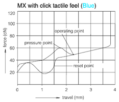 Το μοντέλο που μας δόθηκε για τις ανάγκες αυτού του review φέρει διακόπτες Cherry MX, οι οποίοι είναι οι πιο γνωστοί διακόπτες μηχανικών πληκτρολογίων. Οι μαύροι Cherry MX διακόπτες είναι γνωστοί για τη γραμμική συμπεριφορά κατά τη χρήση τους και την υψηλή αντίσταση που προβάλουν στη πίεση του δακτύλου, γιαυτό και ενδείκνυνται για gaming πληκτρολόγια. Το πληκτρολόγιο παράγεται και σε άλλες τρεις παραλλαγές, με χρήση κόκκινων, μπλε και καφέ διακοπτών. Στις προηγούμενες φωτογραφίες έχουμε μια αναπαράσταση της λειτουργίας κάθε διακόπτη καθώς και το διάγραμμα δύναμης προς απόστασης που διανύει το πλήκτρο.
