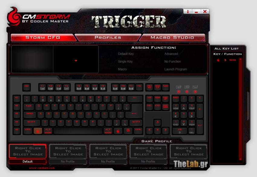 Το πληκτρολόγιο CM Storm Trigger μπορεί να αποθηκεύσει μέχρι 5 προφίλ λειτουργίας στα 64ΚΒ εσωτερικής μνήμης που διαθέτει, ώστε να τα έχουμε διαθέσιμα όπου και αν αποφασίσουμε ότι χρειαζόμαστε το πληκτρολόγιο. Αν ο αριθμός αυτός δεν μας ικανοποιεί, μπορούμε να αποθηκεύσουμε περισσότερα στον υπολογιστή μας ή απλώς να κρατάμε κάποια ως backup, αλλάζοντάς τα με αυτά που έχουμε σώσει στο πληκτρολόγιο.