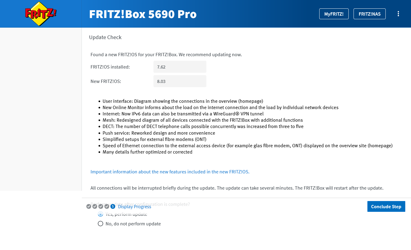 Σε περίπτωση που το FRITZ!Box έρθει με πιο παλιό firmware όπως στην δική μας περίπτωση δεν χρειάζεται να ανησυχούμε. Μετά την ολοκλήρωση της εγκατάστασης θα συνδεθεί αυτόματα στους servers της AVM και θα ψάξει για νεότερο firmware. Σε περίπτωση που βρει θα μας εμφανίσει ένα μήνυμα όπως το παρακάτω. Η εγκατεστημένη έκδοση είναι η 7.62 και η νεότερη που βρέθηκε είναι η 8.03. Πατάμε το Perform update και απλά περιμένουμε μέχρι να ολοκληρωθεί η εγκατάσταση.