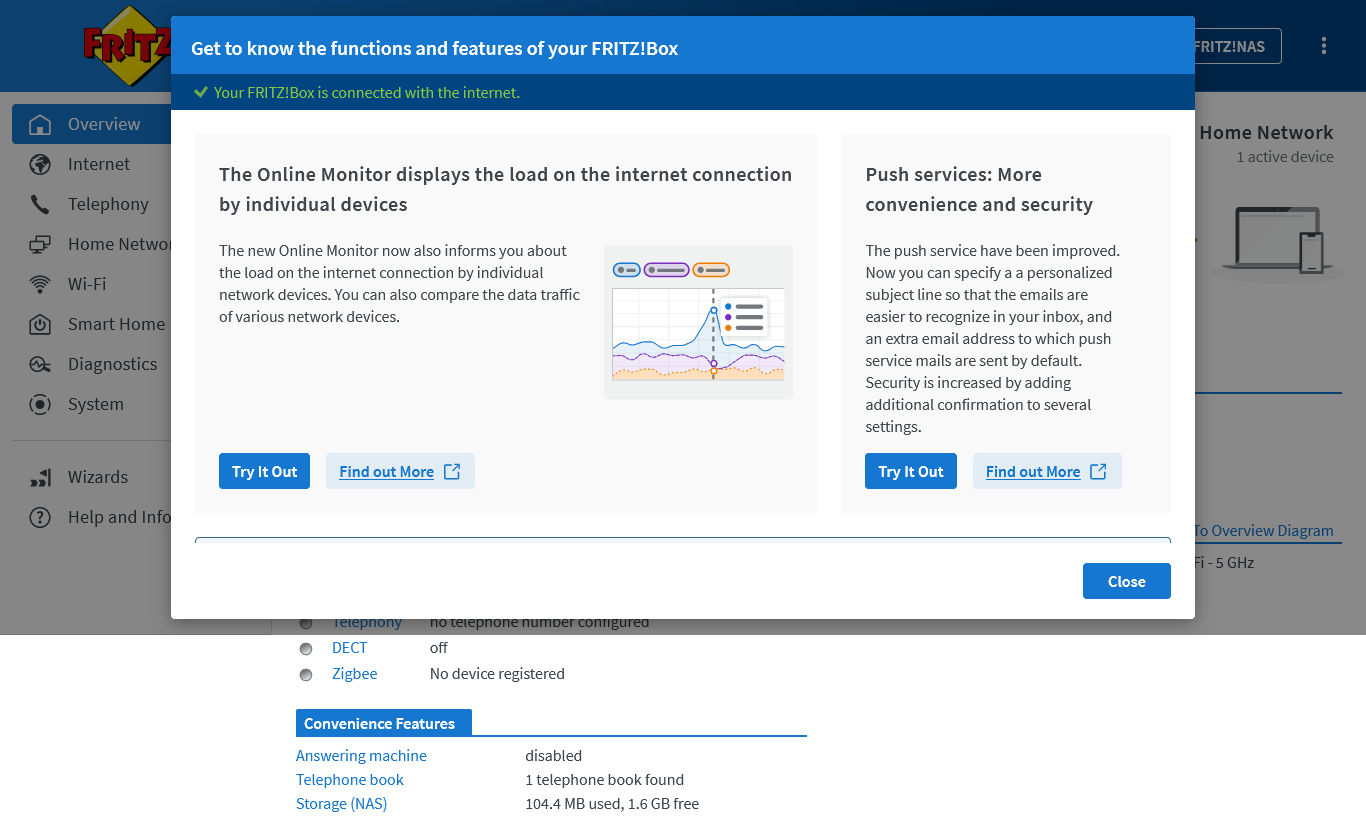 Αφού τελειώσει η εγκατάσταση θα κάνει reboot και μετά θα δούμε την παρακάτω εικόνα που μας ενημερώνει για τα νεότερα features του FRITZ!Os 8.