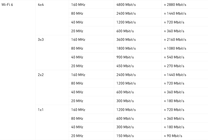 Πολλοί θα αναρωτιούνται ποιες είναι οι μέγιστες ταχύτητες που μπορεί να δώσει το WiFi του FRITZ!Box 5690 Pro. Παρακάτω ένα πινακάκι με το max gross data rate με βάση το WiFi standard, το band, τα data streams και το channel bandwidth.