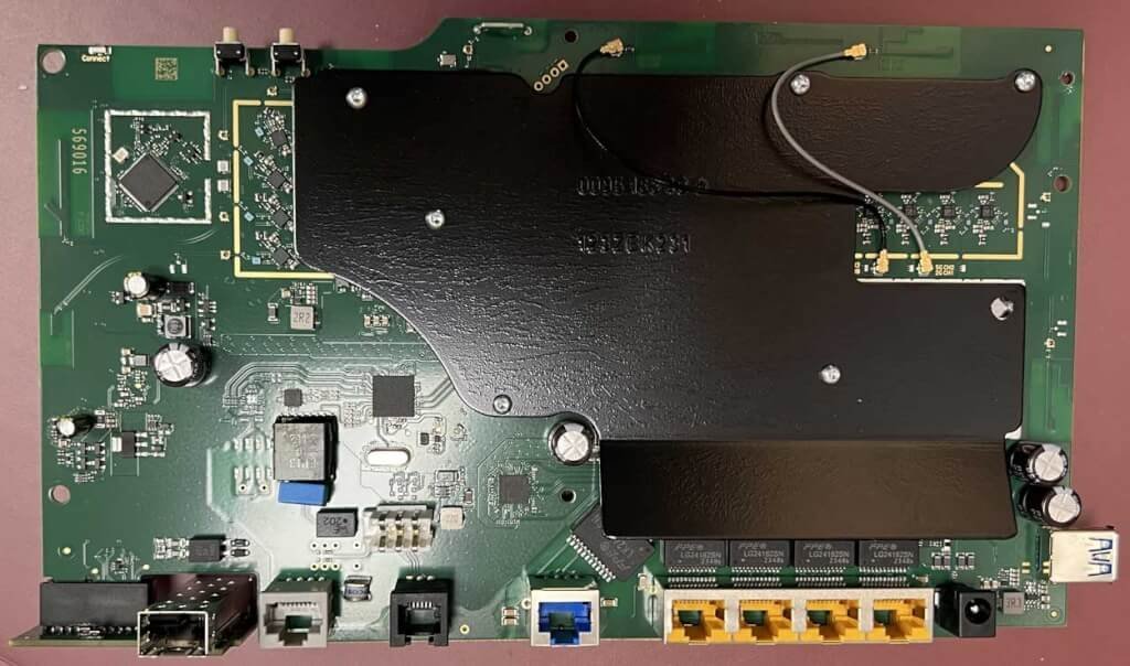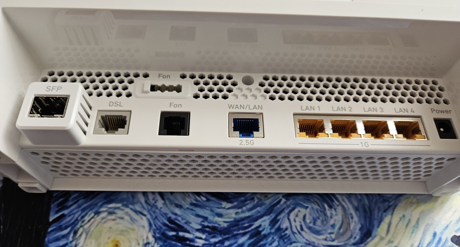 Στο πίσω μέρος του εξοπλισμού υπάρχουν όλες οι θύρες που είναι: SFP, DSL, Fon (TAE, RJ11), WAN/LAN 2.5G, LAN1, LAN2, LAN3, LAN4 και το βύσμα τροφοδοσίας.