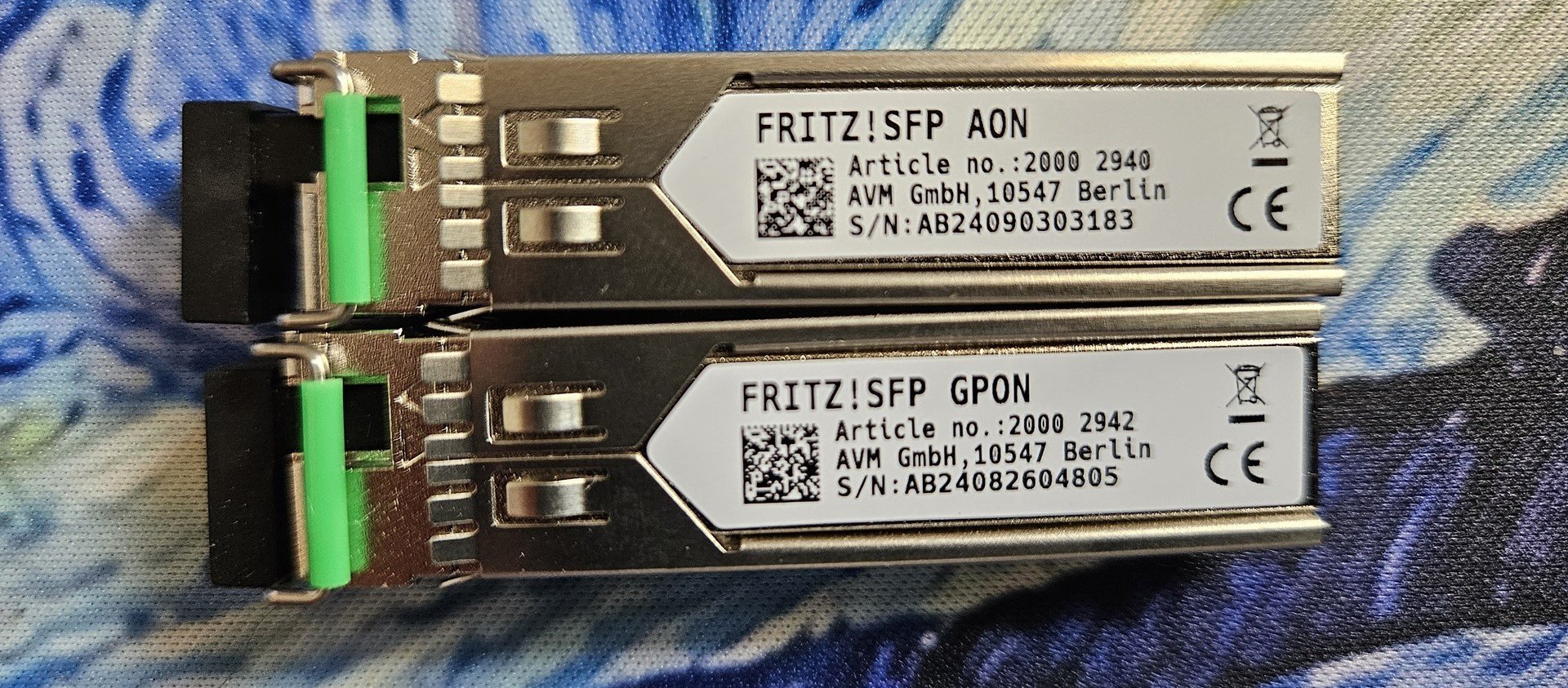 Τα δύο SFP που μας παρέχει η AVM μαζί με το FRITZ!Box. Ένα για AON και ένα για GPON που το δεύτερο είναι που θα χρησιμοποιήσουμε. Εξωτερικά δεν υπάρχει εμφανής διαφορά και τα δύο δέχονται LC-APC οπτική ίνα.