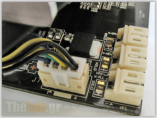 Ακόμη, υπάρχει η δυνατότητα να απενεργοποιηθεί το OCP του GF114 και να ενεργοποιηθεί το Extreme Mode με χειροκίνητη επιλογή μέσω διακόπτη που υπάρχει δίπλα στα προαναφερθέντα leds. Η παρακολούθηση των τάσεων για όσους το επιθυμούν γίνεται από ειδικές υποδοχές που βρίσκονται δίπλα από τον Voltage Controller της N560GTX-Ti Hawk, στο πλάι της κάρτας. Οι υποδοχές είναι οι εξής τρεις: V-GPU, V-MEM και V-PLL. Εννοείται πως η MSI έχει δώσει τη δυνατότητα ρύθμισης όλων των παραπάνω τάσεων μέσω του τελευταίου Afterburner v2.1.0.